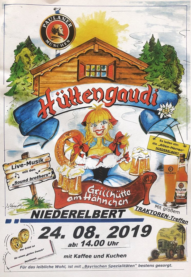 Auch in diesem Jahr luden die "Alten Herren" des SV Niederelbert zur Hüttengaudi ein, deren Erlös einem wohltätigen Zweck zugute kommt. Und auch in diesem Jahr war es wieder ein voller Erfolg. Bei traumhaft schönstem Sommerwetter fanden sich zahlreiche Besucher auf der Grillhütte auf dem Hähnchen ein, um einen tollen Tag mit Traktor-Show, Livemusik, Hüpfburg, Minitraktoren, guten Essen und Trinken zu genießen.